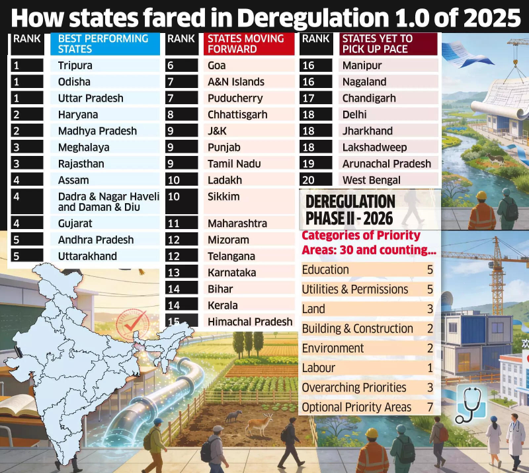 Context: According to the central government’s Deregulation 1.0 report, Uttar Pradesh has become India’s leading state in implementing reforms for making business operations simpler, transparent and investment-friendly.