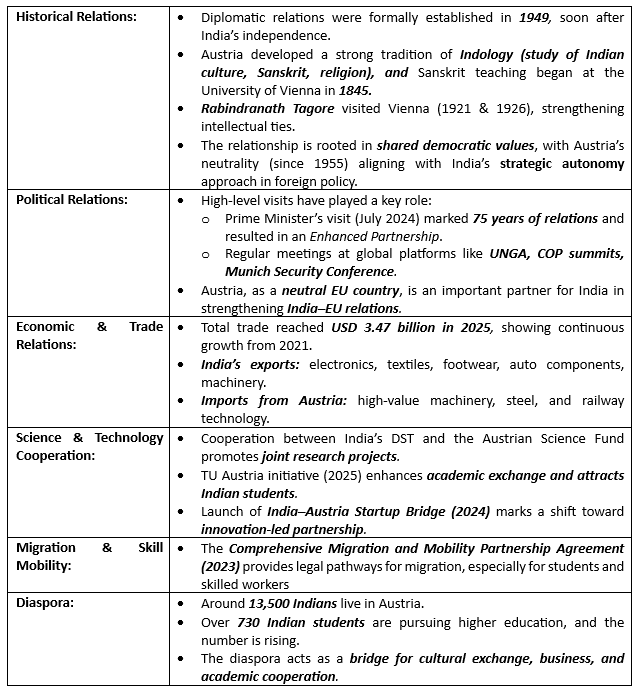 Context: At the invitation of Indian Prime Minister Narendra Modi, Federal Chancellor of Austria, Christian Stocker, paid his first official visit to India, marking the first visit by an Austrian Chancellor in over four decades.