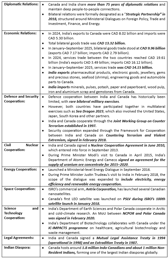Context: At the invitation of Indian Prime Minister Narendra Modi, Canadian Prime Minister Mark Carney paid an official visit to India to revive bilateral relations and strengthen the strategic partnership between the two countries.