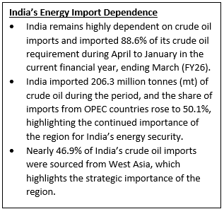 Context: The Finance Ministry’s latest Monthly Economic Review for February 2026, prepared by the Department of Economic Affairs, warned that rising tensions in West Asia could affect India’s energy security and macroeconomic stability.